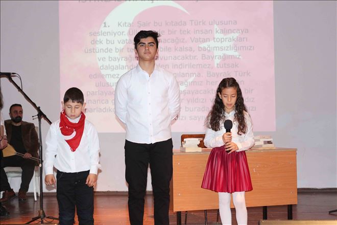Günün anlam ve önemini belirten konuşmayı yapmak üzere kürsüye gelen Haldun Koşay Anadolu Lisesi Okul Müdürü Halil Arslan; ?Bugün 12 Mart İstiklal Marşımızın kabulünün 96. Yıldönümünü kutlamak ve Mehmet Akif Ersoy´u anmak için toplanmış bulunmaktayız. İstiklal Marşımız milletimizin Kurtuluş Savaşı sırasında gösterdiği kahramanlık destanıdır. Türk milletinin kendi vatanında bağımsız olarak onuruyla yaşama arzusu bu kahramanlığı oluşturmuştur. Bağımsızlık benim karakterimdir diyen Mustafa Kemal Atatürk bu düşüncesini Ya İstiklal Ya Ölüm yani Türk milleti esir yaşamaktansa yok olsun daha iyidir diyerek kararlı bir biçimde ortaya koymuştur. Mehmet Akif Ersoy da aynı düşüncededir. İstiklal Marşımızın birinci kıtasında Türk milletinin son ailesi kaldıkça ve o ailenin son ferdi yaşadıkça bağımsızlığımızın sembolü olan Bayrağımız göklerden indirilir diye korkma diyerek bu konudaki inancını belirtir. Milli Marşta bayrak gibi bir milletin bağımsızlık sembolüdür. Bu nedenle milletler için çok önemlidir. Bizim milli marşımızın önemi ise Türk milletinin varoluş mücadelesi için gösterdiği olağanüstü kahramanlığın Mehmet Akif Ersoy´un inançlı bakış açısıyla birleşmesinden meydana gelmektedir. Mehmet Akif bağımsızlığından ödün vermeyen vatan ve millet sevdalısı bir insandır. Mehmet Akif´i tanımak için Safahat´ı iyi anlamak gerekir. Mehmet Akif´in Safahat´ta Türk gençliğine örnek gösterdiği Asım´ın ta kendisidir. Mehmet Akif´in kendi şahsında yaşadığı ve Safahat´ta da gençlere örnek gösterdiği Asım nasıl bir şahsiyettir. Bunu Mehmet Akif´ten dinleyelim. Asıl fazilet, iman, irfan ve bilimle donanmış ahlaklı, kişilikli dimdik durabilen vatanına,milletine ve özgürlüğüne bağlı olan insanları yaratandan ötürü seven asil bir gençtir. Aynı zamanda Asım bir zihniyettir. Bu zihniyettir ki imparatorlukları kuran İstanbul´u feth eden Kurtuluş Savaşını kazanan ve 15 Temmuz´da kendisini tankların önüne atarak seve seve şahadete koşarak milletimizi büyük bir felaketten kurtaran bir zihniyettir. Kurtuluş savaşımızın önderi Mustafa Kemal Atatürk´ü, silah arkadaşlarını, şehitlerimizi, gazilerimizi, şairimiz Mehmet Akif Ersoy´u ve tüm asımları saygıyla selamlıyorum. Akif´in Allah bu millete bir daha istiklal marşı yazdırmasın dileğine Amin diyor Hepinizi saygıyla selamlıyorum? şeklinde konuştu.
