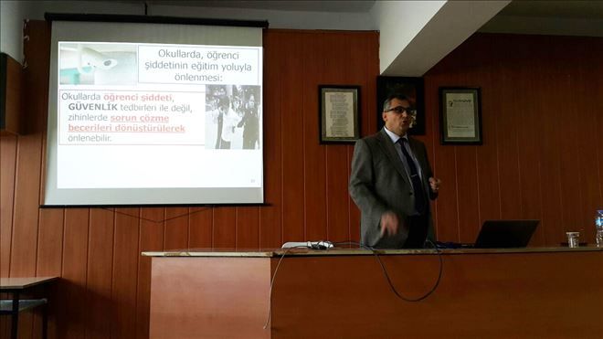 Menemen Mesleki Teknik ve Anadolu Lisesi´nde Dokuz Eylül Üniversitesi Edebiyat Fakültesi Dekanı Psikolog Prof. Dr. Abbas Türnüklü "Arabulucu/Barışyapıcı-Lider Öğrenci Yetişiyor Projesi" kapsamında öğretmenler bilgilendirildi.