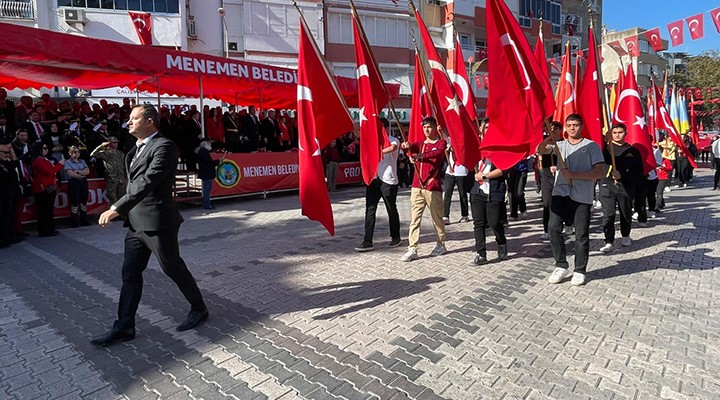 29 Ekim Cumhuriyet Bayramı kutlama programına göre ilçe Kaymakamı Menemen Kaymakamı Fatih Yılmaz, makamında protokol sırasına göre tebrikleri kabul etti. Ardından kutlamalara Atatürk Caddesi Park Durağı alanında devam edildi. Okullar, askeri birlikler ve diğer kuruluşların güzergahta, Kaymakam Fatih Yılmaz, Kışla Komutan Yardımcısı vekili Yarbay Serdar Moraç, Menemen Belediye Başkan Vekili Aydın Pehlivan ve Menemen Cumhuriyet Başsavcısı Hüseyin Kaçar’ın protokolde yerlerini almasıyla kutlama töreni başlatıldı.