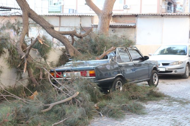 Mermerli Mahallesi Pazar Geçidi Sokak üzerinde park halindeki 35 MBT 61 plakalı otomobilin üzerine çam ağacının dalları devrildi. Dün sabah gerçekleşen olayda arka camın tamamen kırıldığı ve aracın üst kısmının çöktüğü görüldü.