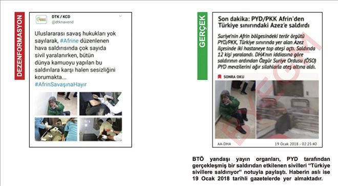 Basın Yayın ve Enformasyon Genel Müdürlüğü, dezenformasyon amaçlı tüm fotoğrafların bugün yürütülen Zeytin Dalı Harekatı´nda değil, Türkiye dışında faklı ülkelerde ve farklı zaman dilimlerinde terör saldırıları ya da diğer bazı olaylar sonrası çekilmiş, bazılarına eklemeler yapılmış kareler olduğunu gözler önüne sererek, gerçekleri bir broşürde topladı. Türkçe, Arapça, Rusça, Farsça, İngilizce, Fransızca, Almanca, Kürtçe olmak üzere 8 dilde yayınlanan broşür, Türkiye´de akredite olmuş uluslararası basın mensuplarına, tüm ulusal medyaya ve basın müşavirlikleri aracılığıyla yurt dışındaki uluslararası medya kuruluşları ve çalışanlarına iletildi.