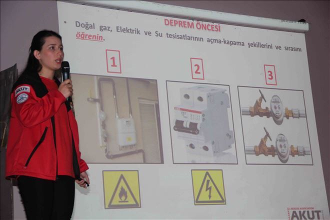 AKUT İzmir Seminer Birim Sorumlusu Yrd. Gülay Öker de slayt sunum eşliğinde öncelikle AKUT´un tanıtımını yaptı. Depremin değil bizlerin yarattığı ihmallerin can kaybına neden olduğunu ifade eden Öker, deprem öncesi, anı ve sonrasında alınması gereken tedbirleri anlattı.