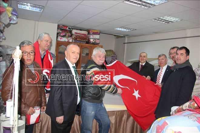 Menemen Kaymakamı Gülihsan Yiğit´in öncülüğünde esnafa yapılan ziyaretlerde Mehmetçiğe destek olmak ve milli birliği sağlamak adına Türk Bayrağının mekanlara asılması konusunda esnafa çağrıda bulunuldu.