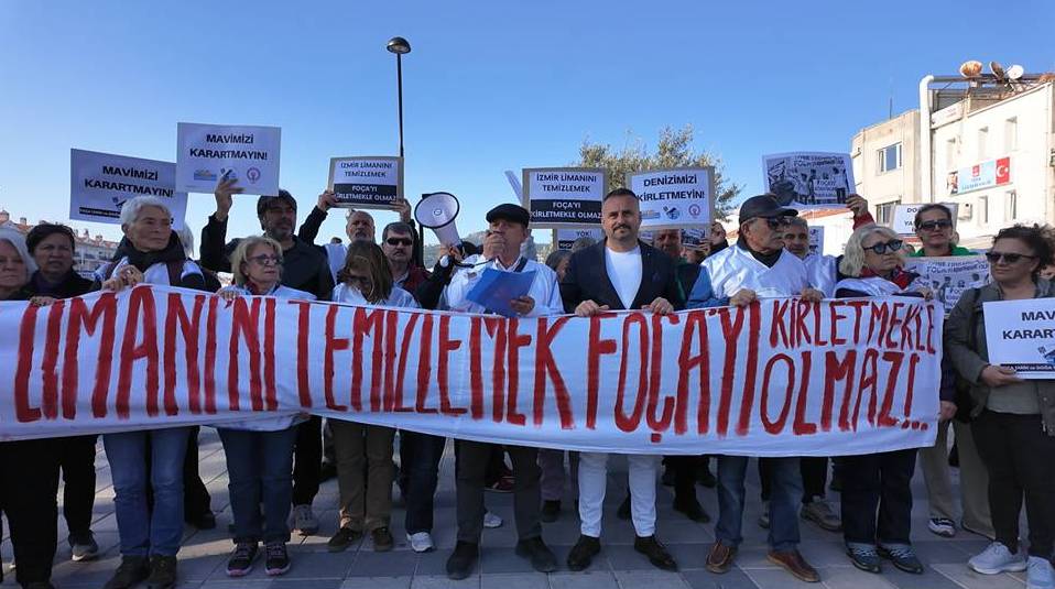 İzmir Körfezini temizleme çalışmaları kapsamında çıkarılan dip çamurunun Karaburun ve Foça İlçeleri arasındaki deniz alanına dökülmesi ve Foçalı balıkçıların ağlarına balık yerine çamur dolmasıyla ortaya çıkan durum Foçalılar tarafından bugün düzenlenen basın açıklaması ve oluşturulan insan zinciriyle protesto edildi. Okunan açıklamada Çevre, Şehircilik ve İklim Değişikliği Bakanlığının Karaburun ve Foça Özel Çevre Koruma(ÖÇK) bölgeleri arasında döküm için izin verdiği alanı iptal etmesi, İzmir Büyükşehir Belediyesi’nin de çamuru Foça Bölgesine dökmekten vazgeçmesi talep edildi.
