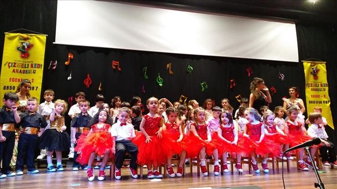 Menemen´e bağlı Egekent-2 mahallesinde eğitim faaliyetlerini sürdüren Özel Çizmeli Kedi Anaokulu´nun öğrencileri yılsonu gösterileriyle izleyenleri kendilerine hayran bıraktı. Çalışkanlıklarını ve yeteneklerini renk cümbüşü kıyafetler içinde sergileyen minikler ailelerine mutluluk gözyaşları döktürdü.