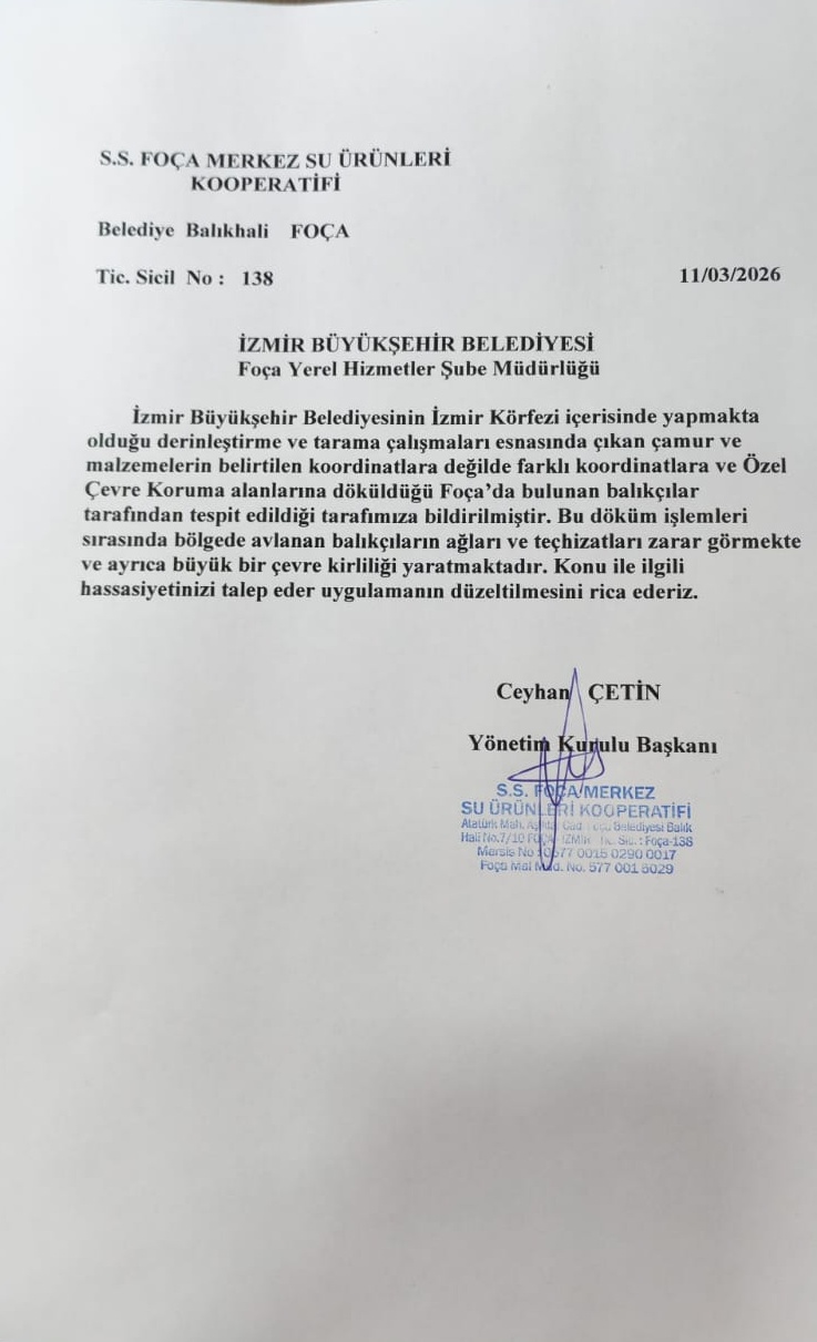 Foça Merkez Su ürünleri Kooperatifi Başkanı Ceyhan Çetin, balıkçı arkadaşlarının çamurla yaşadıkları sıkıntıların hemen ardından ilgililere yazılı müracaatta bulunup tedbir alınmasını istediklerini, durumun hem balıkçılığı hem turizmi tehdit eder hala geldiğini söyledi. Ceyhan Çetin; “Son bir haftadır balıkçılarımız denizde çamur dağlarıyla karşılaştıklarını ve denize attıkları ağları bölerek kaldırdıklarını söylediler. Yaptıkları araştırmalarda ve Marine Traffic’ten takipte, çamur taşıyan gemilerin döküm alanına değil de çamuru farklı bölgelere döktüğünü tespit ettiler. Limana zararla geldiklerini, böyle giderse ekosistemin çökeceğini, bu alanlarda hiç balıkçılık faaliyeti yapılamayacağını anlattılar. Denizlerimizi koruma amaçlı olarak hemen gereken mercilere dilekçelerimizi verdik. Burası bir ÖÇK alanı. Dökülen çamurların adalar kıyılarına kadar ulaştığı söyleniyor. Bu alanda çalışılırken bu çamur dağlarına rast geliniyor. Yarın deniz kirliliği had safhaya gelecek, balığı vitrinde göreceğiz. Buraları Gırgır ve Trol teknelerinin avlak sahaları. Bunlara yasak olan zamanlarda geleneksel balıkçımız bu alanlarda avlanabiliyor. Bir an önce bu hatadan geriye dönülmesi, belirlenen koordinatların dışına çamur dökülmemesi için gerekli denetimlerin yapılmasını istiyoruz. Bu çamur denize dökülmeye devam edilirse, İmbat denizleriyle, dip akıntılarıyla yukarı kalkacak çamur suyu bulandırır. Bu bulantı kıyılara gelir ve Foça’da turizmi de etkiler. İnsanlar denize girmez hale gelir” dedi.