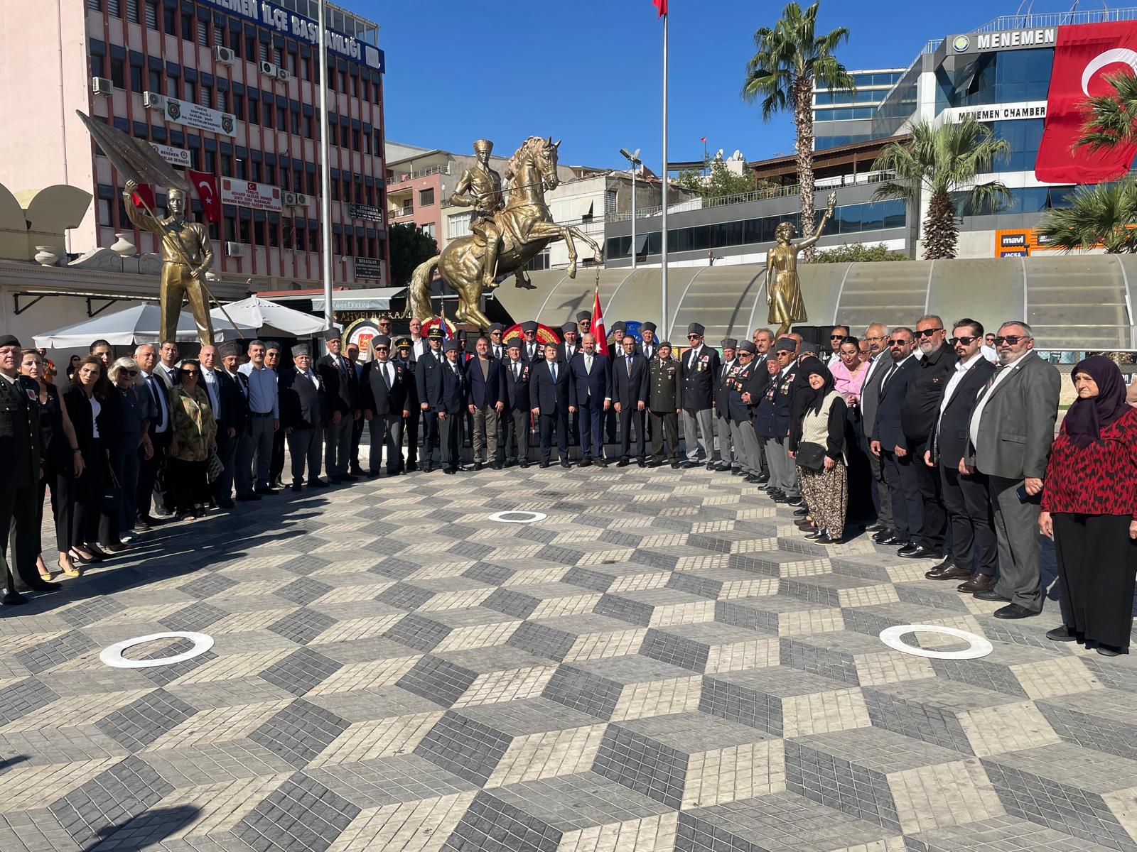 Atatürk Anıtı’na Kaymakamlık, Garnizon Komutanlığı, Belediye Başkanlığı ve Türkiye Muharip Gaziler Menemen Şube Başkanlığı’nın çelenk koyması ile başlayan tören, saygı duruşu ve İstiklal Marşı'nın okunmasıyla devam etti.
