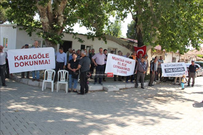 Meydanda toplanan yöreden ve Menemen´den yurttaşlar mahkeme heyetini alkışlarla ve ?KÖYÜMÜZDE TAŞ OCAĞI İSTEMİYORUZ?-?KARAGÖLE DOKUNMA!?-?MUHTAR HALK ELELE ORMANIMIZI ELLEME? pankartlarıyla karşıladı.