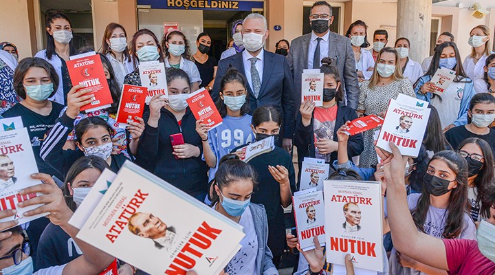 MEBGEM öğrencileri de, hem ziyaretleri hem de Nutuk hediyeleri için Başkan Pehlivan’a çiçek vererek teşekkür etti.