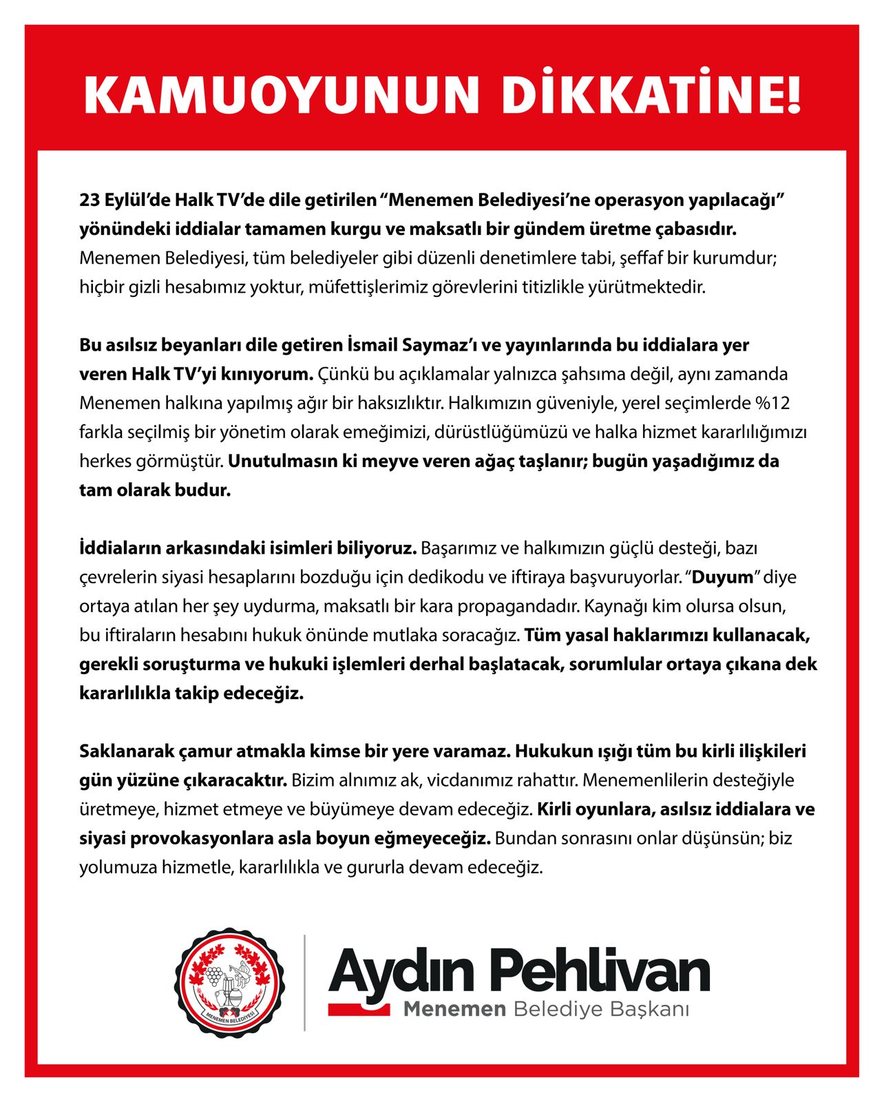 İddiaları dile getiren gazeteci İsmail Saymaz ve bu açıklamalara yer veren Halk TV’yi kınadığını ifade eden Pehlivan, “Bu açıklamalar sadece şahsıma değil, aynı zamanda Menemen halkına yapılmış ağır bir haksızlıktır. Halkımızın güveniyle, emeğimizle ve kararlılığımızla hizmet ediyoruz. Unutulmasın ki meyve veren ağaç taşlanır.”