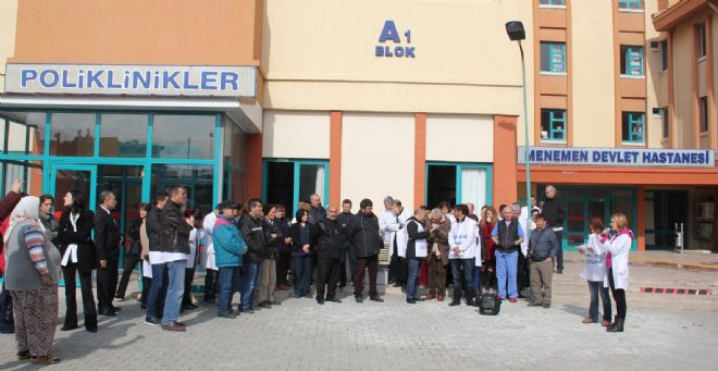 Geçtiğimiz cuma günü tüm Türkiye’de olduğu gibi Menemen Devlet Hastanesi’nde sağlık çalışanlarının tamamına yakını da çocuk, kanserli, doğum ve diyaliz gibi acil hizmetler dışında çalışmadı.
