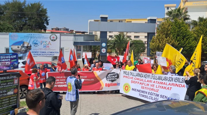 Şu anda yanında açıklama yaptığımız Menemen Şehit Ahmet Özsoy Fen Lisesinde üyemiz olan 3 öğretmen arkadaşımız, 1 Eğitim İş üyesi, 1 Eğitim Bir Sen üyesi ve herhangi bir sendikaya üye olmayan 3 arkadaşımız hiçbir gerekçe gösterilmeden yeniden görevlendirilmemiştir. Bu okulumuza son atanan müdürlerin Proje Okulları Atama Yönetmeliğine aykırı bir şekilde yandaş sendikaya üye olan müdürlerin atanması da dikkat çekicidir.
