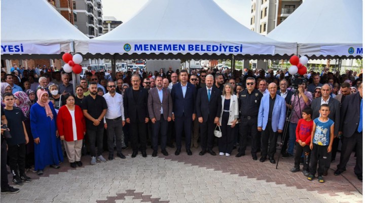 Menemen Belediyesi’nin, Koyundere’ye kazandırdığı kapalı pazar yeri, halı saha ve yeni nesil park düzenlenen törenle hizmete açıldı. Menemen’in her bir metrekaresi, her mahallesi gibi Koyundere’nin de yaşam kalitesini yükseltmek için gece gündüz demeden çalıştıklarını ifade eden Pehlivan, “Bu tesislerimizin yanı sıra bütün yollarını yenilediğimiz Koyundere’mize, taziye evi, gençlik merkezi ve bir anaokulu kazandırıyoruz. Buradan ilan ediyorum ki; Menemen’de yaşamak ayrıcalık olacak. Daha da fazlasını yapacağız çünkü Menemen, her şeyin en iyisine layık” dedi.