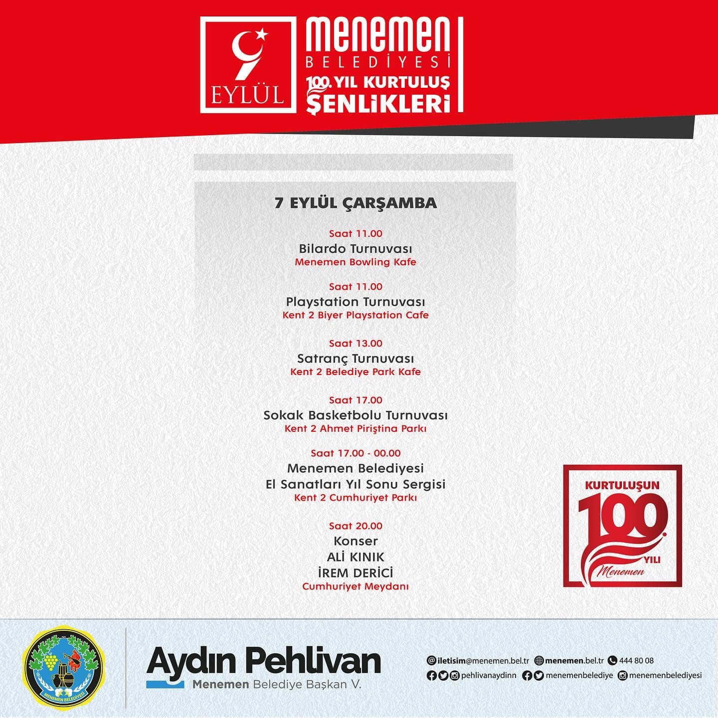 Bir asıra yakışır program kapsamında ünlü sanatçılarla da buluşacaklarına açıklayan Pehlivan, “7 Eylül Çarşamba akşamı sevilen şarkıcılar Ali Kınık ve İrem Derici Cumhuriyet Meydanı’nda birbirinden güzel şarkılarını Menemenlilerle birlikte söyleyecek. 8 Eylül Perşembe akşamı da, Oğuz Aksaç ve Koray Avcı Kent-2’de sahne alacak. Menemenimizin 100’üncü Kurtuluş Günü’nde ise ünlü şarkıcı Funda Arar, Cumhuriyet Meydanı’nda kurtuluş coşkumuzu en üst seviyeye çıkaracak. Bu etkinlikler, kıymetli vatandaşlarımızı bir araya getirecek, birlik ve beraberliğimizin güçlenmesine, pekişmesine katkıda bulunacak. Tüm vatandaşlarımızı 7-8-9 Eylül tarihlerinde kurtuluş heyecanını, sevincini ve coşkusunu birlikte yaşamaya davet ediyorum. Gelin kentimizin 100’üncü Zafer günlerini geçmiş yıllarda olduğu gibi yine hep birlikte büyük bir coşkuyla kutlayalım” diye konuştu.
