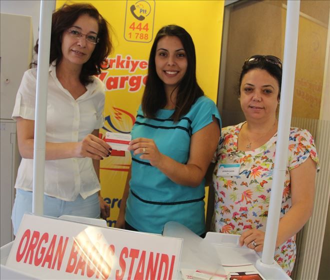 Menemen PTT Şubesi´ne stant açan Menemen İlçe Sağlık Müdürlüğü Organ Bağışı biriminde görevli ebeler Şermin Şahin ve Pelin Aslan vatandaşlara broşür dağıtarak organ bağışı hakkında bilgilendirdi.