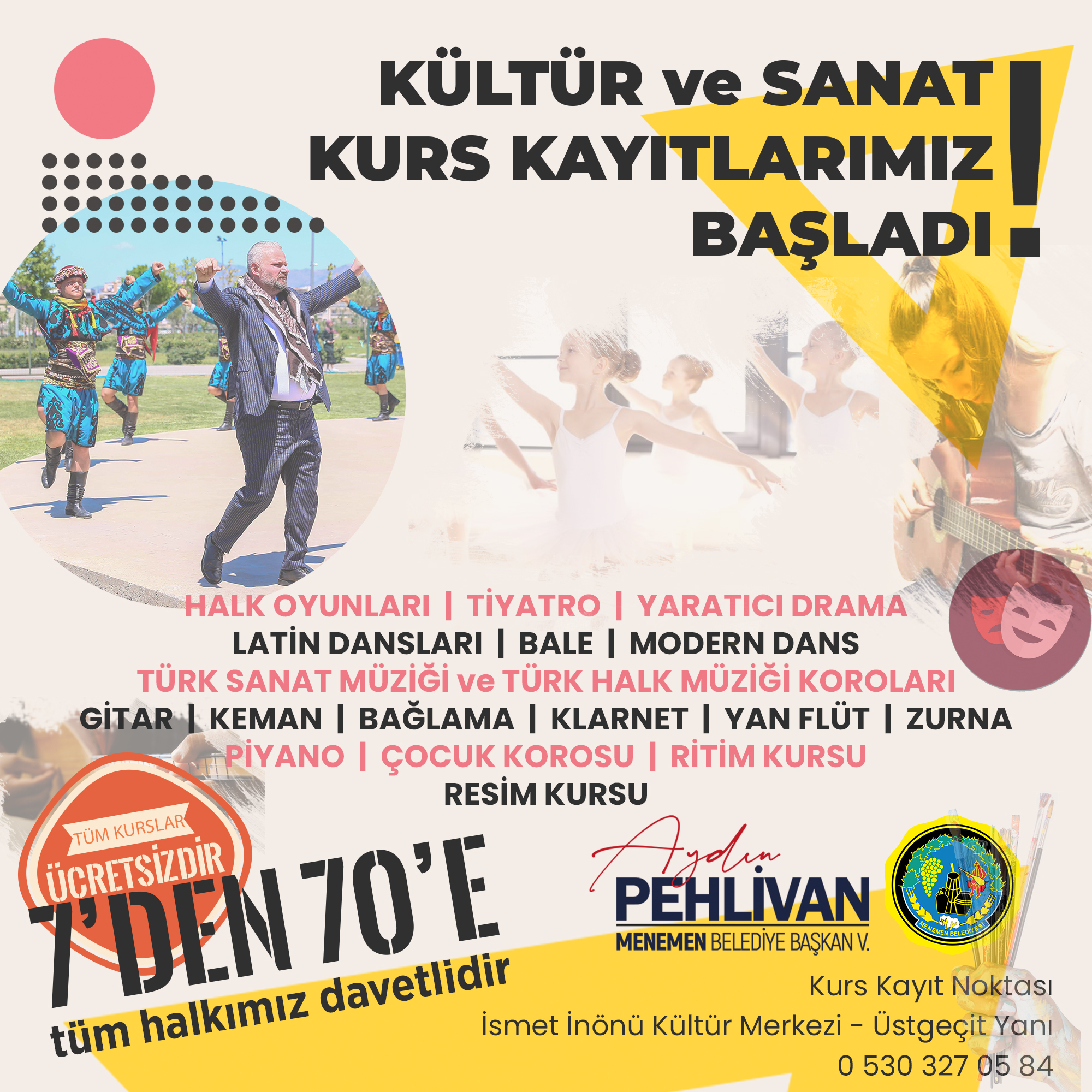 Ücretsiz düzenlenecek kurslara 7’den 70’e herkesi davet eden Menemen Belediye Başkan Vekili Aydın Pehlivan, “Menemen’de sanatın gelişmesini ve her kesimin bu gelişmeye dâhil olması için elimizden geleni yapıyoruz. Yapmaya da devam edeceğiz. Pandemi nedeniyle bir süre önce kapanan kurslarımızı, vatandaşlarımızla yeniden buluşturuyoruz. Düzenleyeceğimiz kültür ve sanat dolu kurslarımızla, değerli hemşehrilerimizin vaktini en verimli şekilde geçirmelerini ve hayatlarına anlam katmayı hedefliyoruz. Her yaştan kursiyerlerimize, müzikten tiyatroya, edebiyattan halk oyunlarına kadar sanatın tüm alanlarında hizmet sunacağız. Tüm ilçe sakinlerimizi kurslardan faydalanmaya davet ediyorum” dedi.