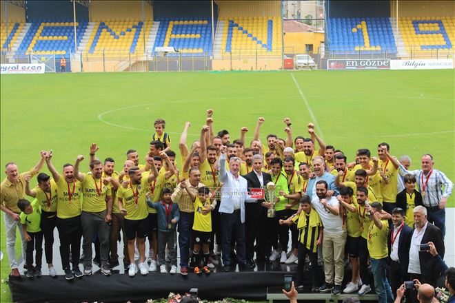 TFF 2. Lig Kırmızı Grup´ta 68 puanla şampiyon olarak tarihinde ilk kez Spor Toto 1. Lig´e yükselen temsilcimiz Menemen Spor, kupasına kavuştu. Şampiyonluğu garantiledikten sonra ligin son hafta mücadelesinde deplasmanda Konya Anadolu Selçukspor´a 4-3 yenilen Menemen´in kupa töreni için İlçe Stadı´nda platform oluşturuldu. Futbolcular, Teknik Direktör Suat Kaya ve yardımcıları, isimleri tek tek anons edilerek platforma çağrıldı. Futbolculuk kariyerinde Galatasaray´la 8 lig şampiyonluğu yaşayıp en çok şampiyonluk kazanan futbolculardan olan, UEFA Kupası ve Süper Kupa´yı havaya kaldıran Suat Kaya, Menemen´de teknik adam olarak bir ilki yaşadı. Sarı-lacivertli takıma madalyalarını ve şampiyonluk kupasını Türkiye Futbol Federasyonu İcra Kurulu Üyesi Ali Düşmez verdi. 300 civarında taraftar kapalı tribünde kupa seremonisini izledi. Kupayı kaldırdıktan sonra büyük sevinç yaşayan Menemenli futbolcular, Menemen Spor Onursal Başkanı Tahir Şahin ve teknik heyetle birlikte şampiyonluk şarkıları eşliğinde üstü açık otobüsle ilçede tur attı.