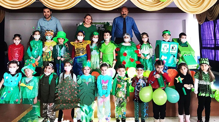 Menemen Kubilay İlköğretim Okulu öğretmenleri ve anasınıfı öğrencileri geri dönüşüm yapılabilen atık materyallerden ürettikleri giysiler ile kostüm defilesi düzenledi.